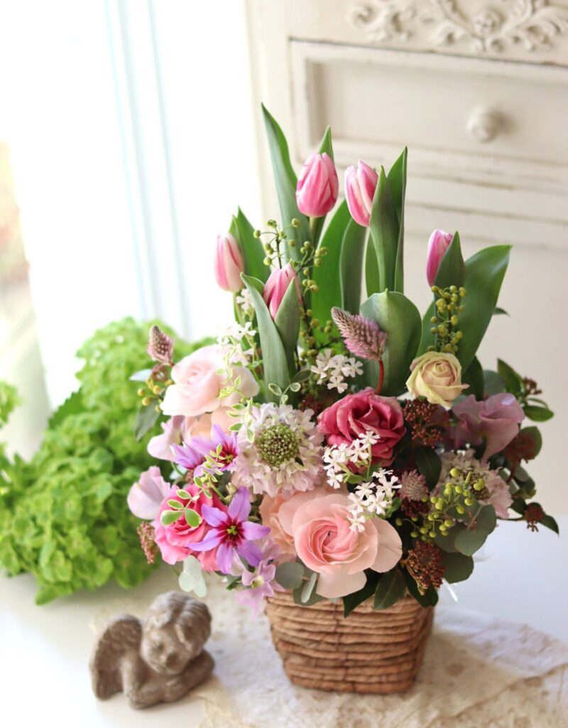 お友達のご命日に…と毎年ご注文いただきます。とてもお花がお好きな方だったそうで、春の可愛いお花たっぷりで、癒しのアレンジに。いつもありがとうございます。